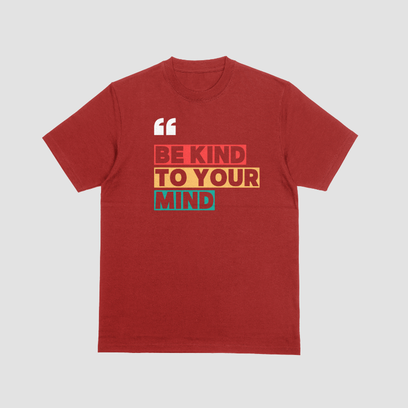 Add a touch of inspiration to your wardrobe with this eye-catching maroon T-shirt. Featuring the uplifting slogan “Be Kind to Your Mind”, it’s designed to keep you stylish, comfortable, and motivated all day long.