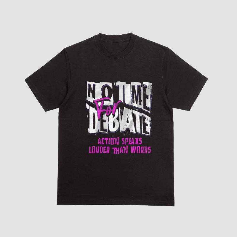 Own the moment in our “No Time to Debate” Black T-shirt — a no-nonsense design for those who walk the talk. With its sleek black color and assertive message, this tee embodies the mindset of leaders, doers, and change-makers who let their actions speak for them.