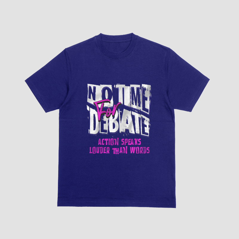 Speak volumes without saying a word in our “No Time to Debate” T-shirt — a bold statement for the doers, the movers, and the changemakers. Set in a sharp blue tone that stands out with confidence, this tee is all about living your truth through action, not just talk.
